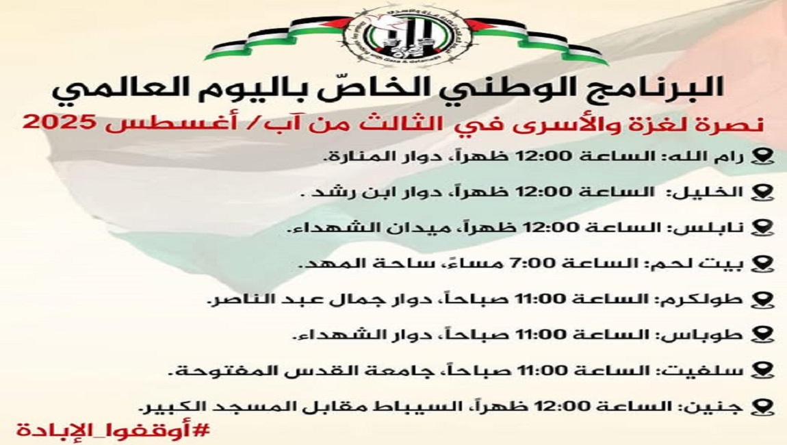 طباعة إعلان البرنامج الوطني الخاصّ باليوم العالمي نصرة لغزة والأسرى في الثالث من آب/ أغسطس 2025 في 30 تموز/يوليو 2025. نشر في عارض الاخبار