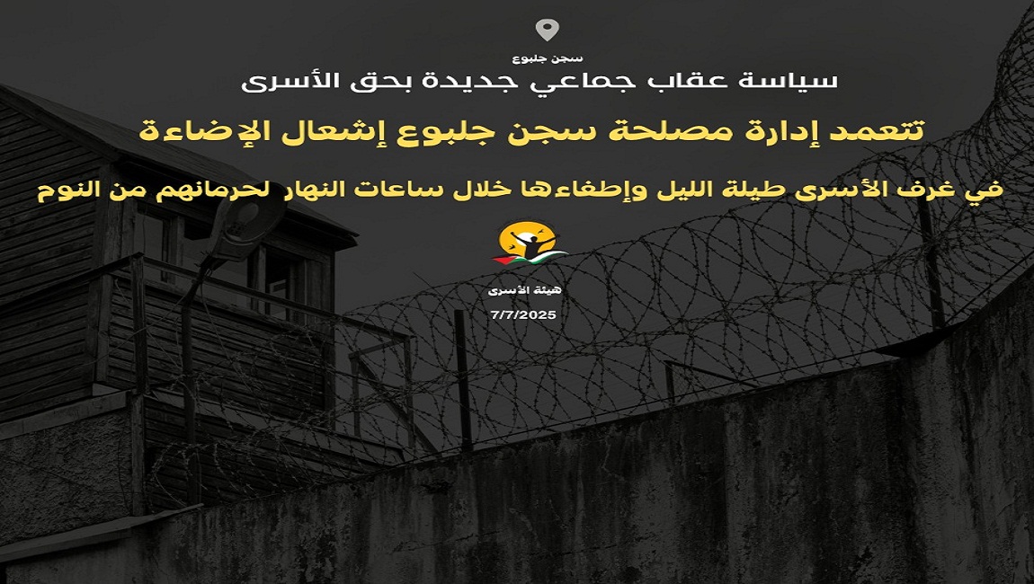 طباعة أسرى سجن جلبوع يشتكون من تصعيد خطير جدا بمعاملة إدارة مصلحة السجون حيث يتعرضون للضرب و القمع بواسطة أسلحة جديدة منها الفرد الكهربائي في 06 تموز/يوليو 2025. نشر في عارض الاخبار