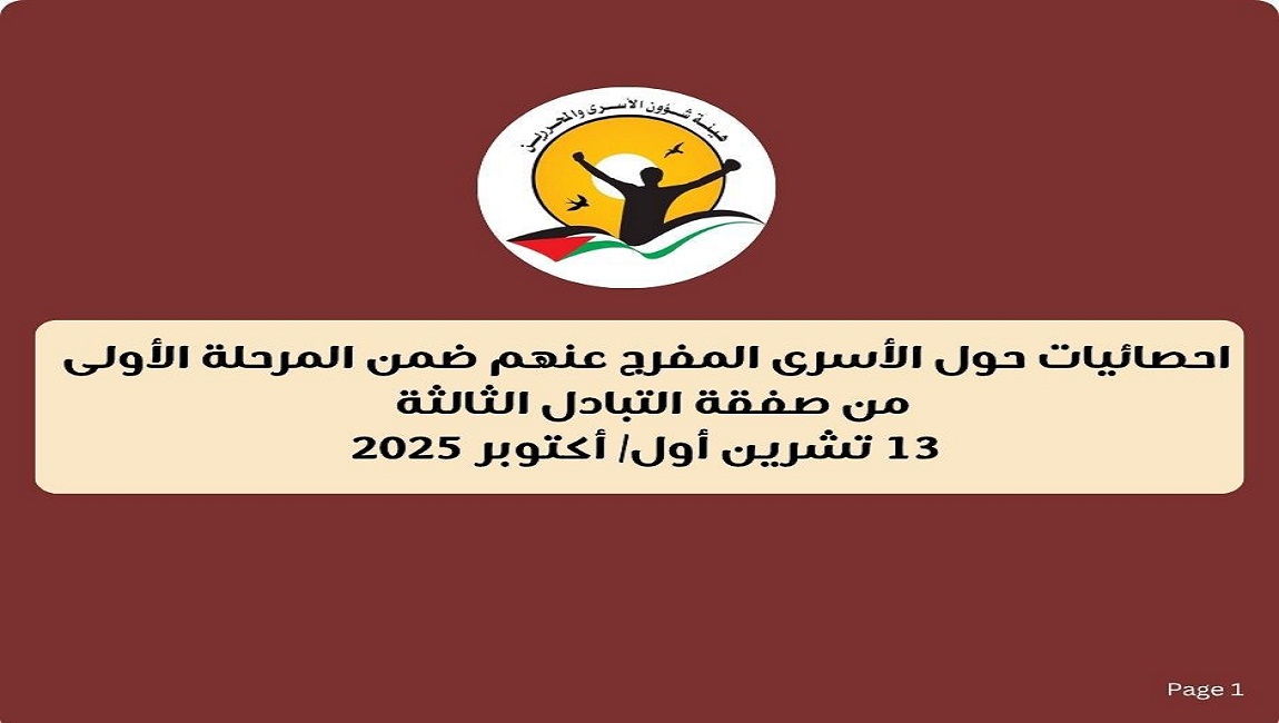 طباعة إحصائيات حول الأسرى المفرج عنهم في الدفعة الأخيرة ضمن المرحلة الاولى من صفقة التبادل الثالثة، 13 تشرين الأول/أكتوبر 2025 في 21 تشرين1/أكتوير 2025. نشر في عارض الاخبار