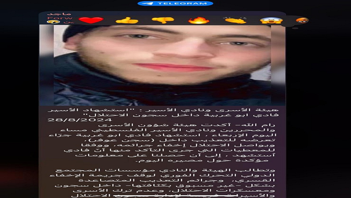 طباعة *استشهاد المواطن أيمن راجح عابد جرّاء الضرب والتّعذيب بعد اعتقاله فجرا من منزله في جنين* في 02 أيلول/سبتمبر 2024. نشر في الاخبار العاجلة
