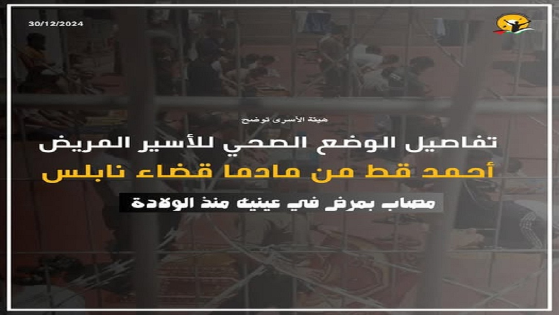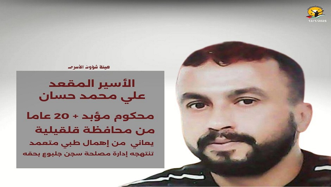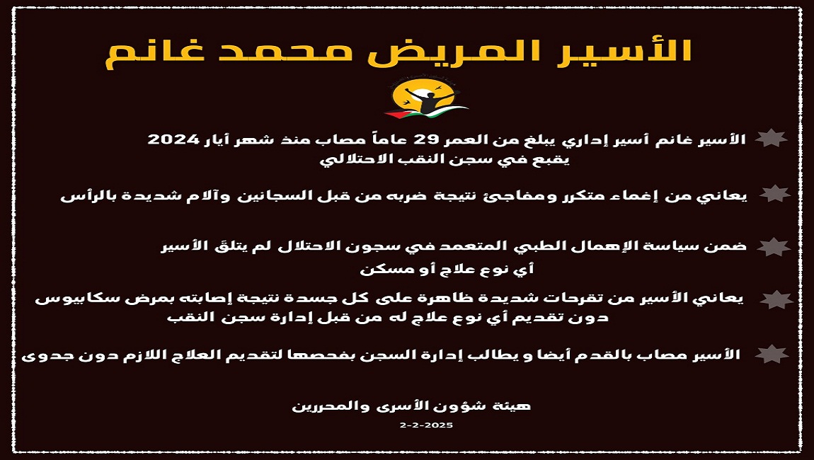 طباعة الأسير المريض محمد غانم يعاني من الإهمال الطبي الممنهج في سجون الاحتلال في 02 شباط/فبراير 2025. نشر في الإهمال الطبي