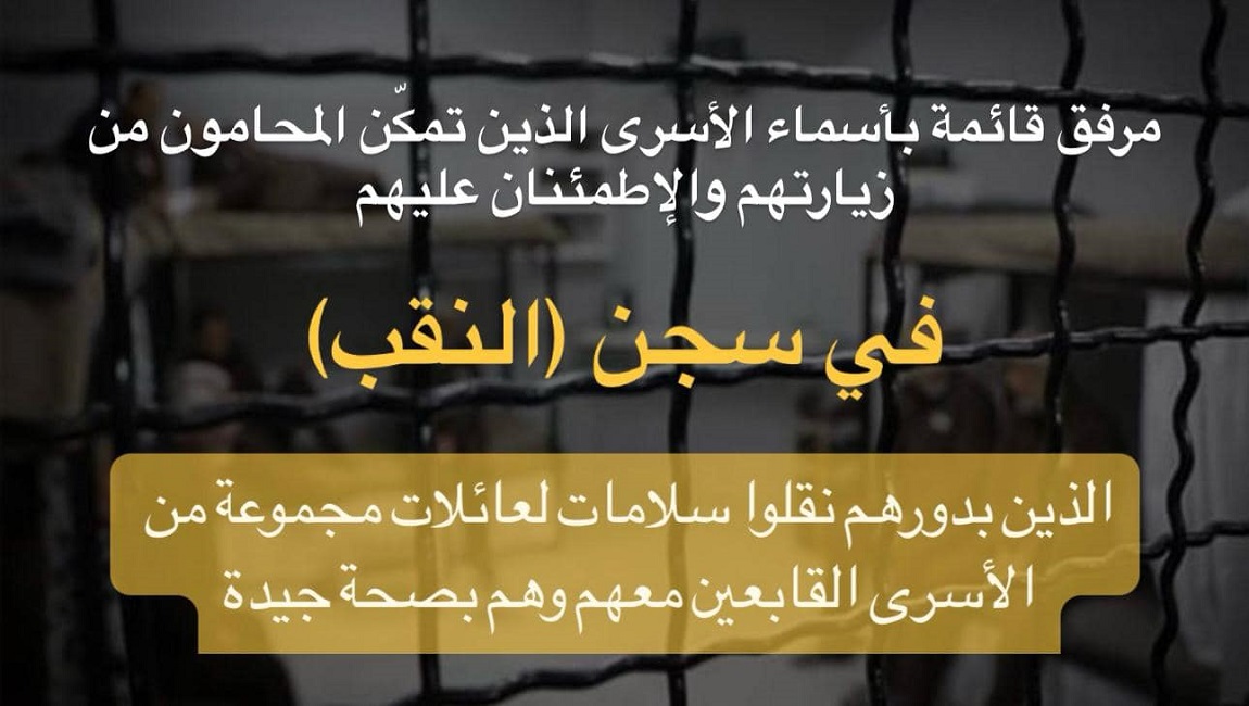 طباعة 👈 *مرفق قائمة بأسماء الأسرى الذين تمكّن المحامون من زيارتهم والإطمئنان عليهم في سجن (النقب)، الذين بدورهم نقلوا سلامات لعائلات مجموعة من الأسرى القابعين معهم وهم بصحة جيدة* في 27 كانون2/يناير 2024. نشر في عارض الاخبار