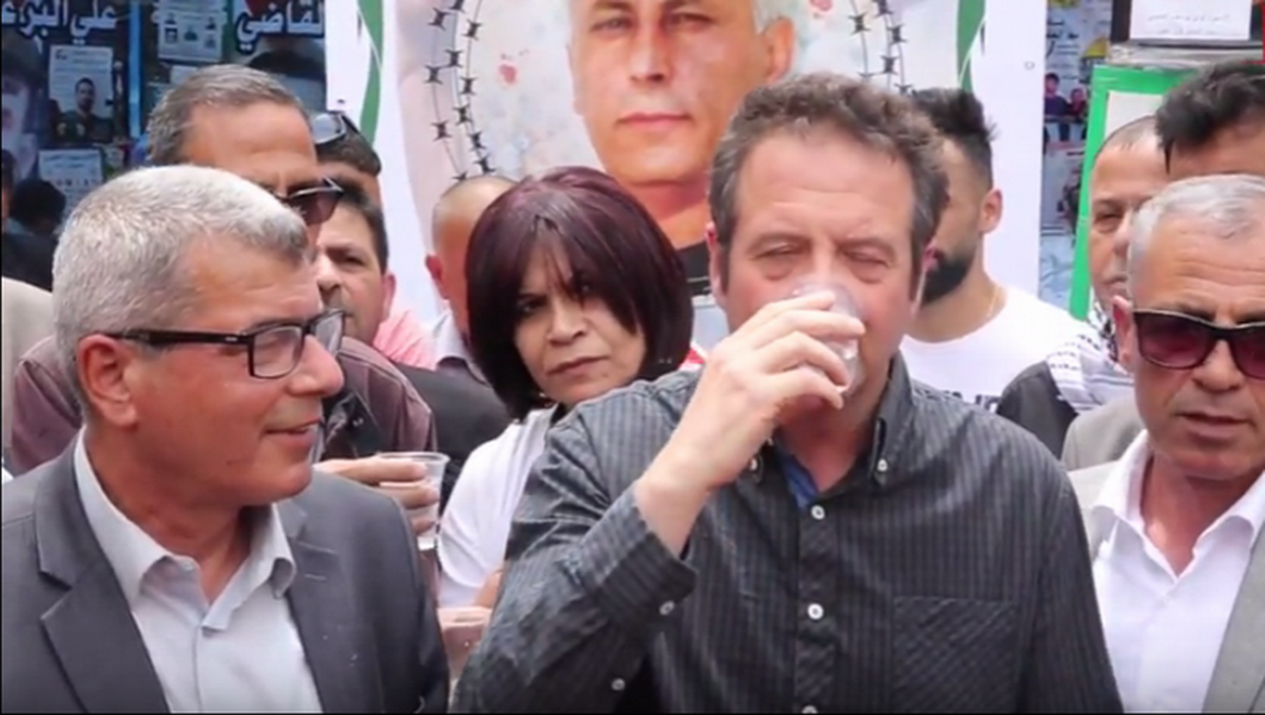 طباعة الممثل العالمي والناقد السياسي مارك توماس يقبل تحدي الوزير قراقع بشرب الماء والملح في 30 نيسان/أبريل 2017. نشر في عارض الاخبار