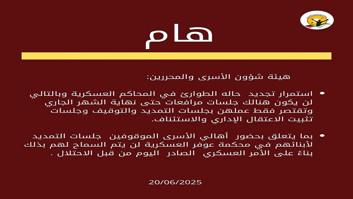 طباعة استمرار تجديد حاله الطوارئ في المحاكم العسكرية وبالتالي لن يكون هنالك جلسات مرافعات حتى نهايه الشهر الجاري في 20 حزيران/يونيو 2025. نشر في الاخبار العاجلة