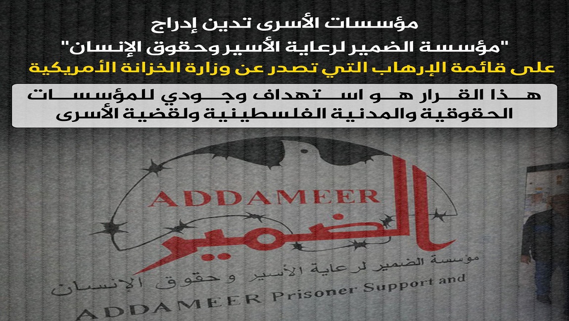 طباعة مؤسسات الأسرى تدين إدراج "مؤسسة الضمير لرعاية الأسير وحقوق الإنسان" على قائمة الإرهاب التي تصدر عن وزارة الخزانة الأمريكية. في 15 حزيران/يونيو 2025. نشر في الاخبار العاجلة