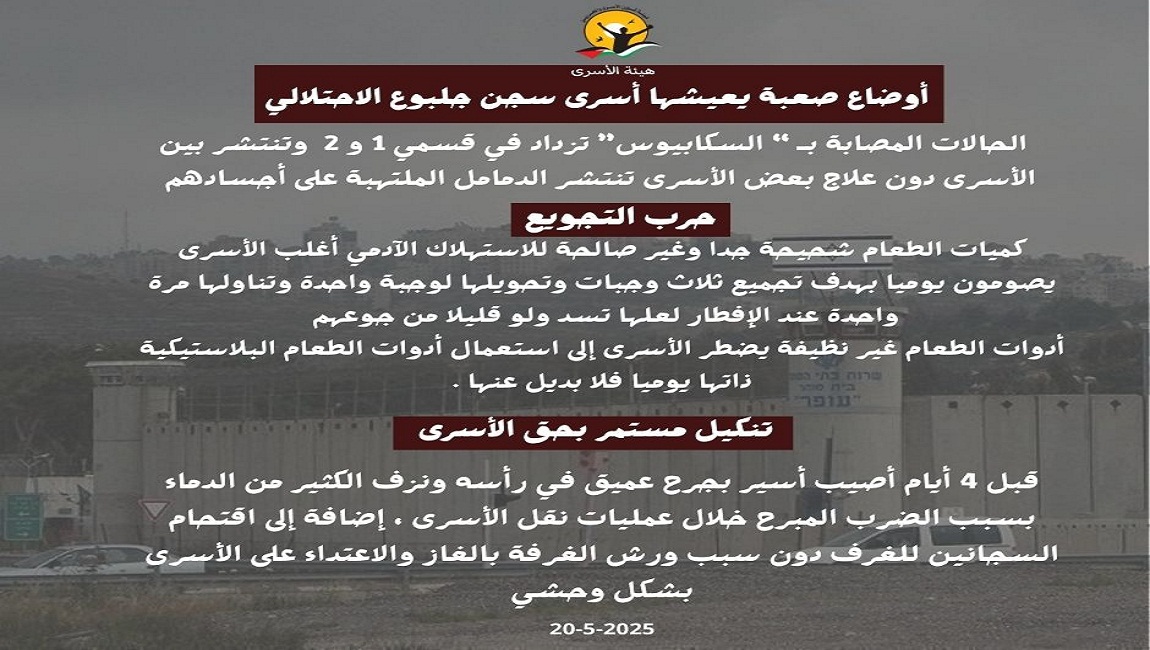 ظروف اعتقال صعبة يعيشها أسرى سجن جلبوع الاحتلالي