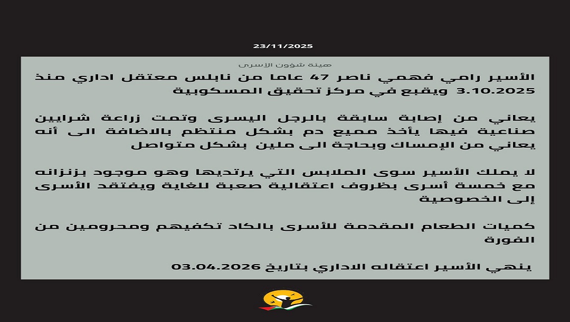 طباعة الأسير رامي ناصر من نابلس يعاني المرض والإهمال الطبي المتعمد في المسكوبية في 23 تشرين2/نوفمبر 2025. نشر في الاخبار العاجلة