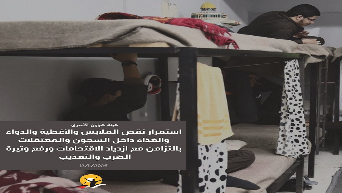 طباعة استمرار نقص الملابس والأغطية والدواء والغذاء داخل السجون والمعتقلات بالتزامن مع ازدياد الاقتحامات في 12 تشرين2/نوفمبر 2025. نشر في الاخبار العاجلة