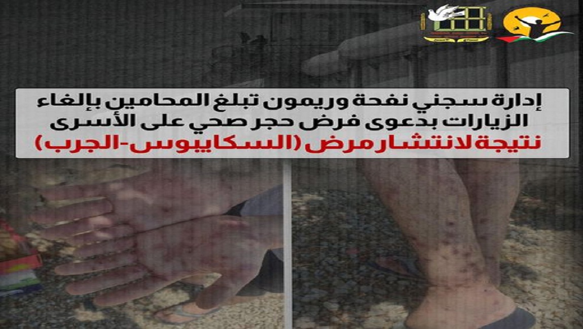 طباعة *هيئة الأسرى ونادي الأسير: "إدارة سجني نفحة وريمون تبلغ المحامي بإلغاء الزيارات بدعوى فرض حجر صحي على الأسرى نتيجة لانتشار مرض (السكايبوس-الجرب)"* في 03 أيلول/سبتمبر 2024. نشر في الاخبار