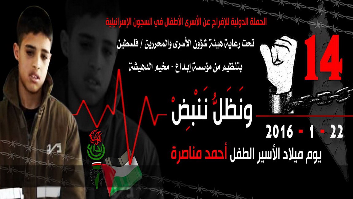 طباعة ونظل ننبض...الحملة العالمية لاطلاق سراح الأسرى الأطفال هيئة الأسرى: أكثر من 50 دولة ومؤسسة ستشارك في حملة اطلاق سراح الطفل مناصرة يوم ميلاده في 17 كانون2/يناير 2016. نشر في الاخبار