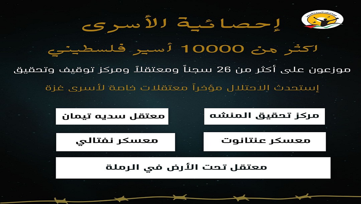 طباعة احصائية الاسرى اكثر من 10000 أسير فلسطيني في 28 تموز/يوليو 2025. نشر في تقارير احصائية احصائية الاسرى اكثر من 10000 أسير فلسطيني
