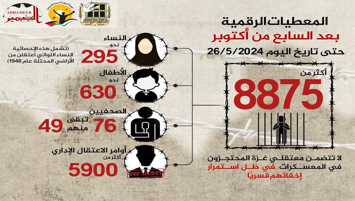طباعة *في اليوم الـ233 على الإبادة الجماعية* 🔴 *بلغت حصيلة حالات الاعتقال في الضفة بما فيها القدس ما لا يقل عن (8875)* في 26 أيار 2024. نشر في تقارير احصائية