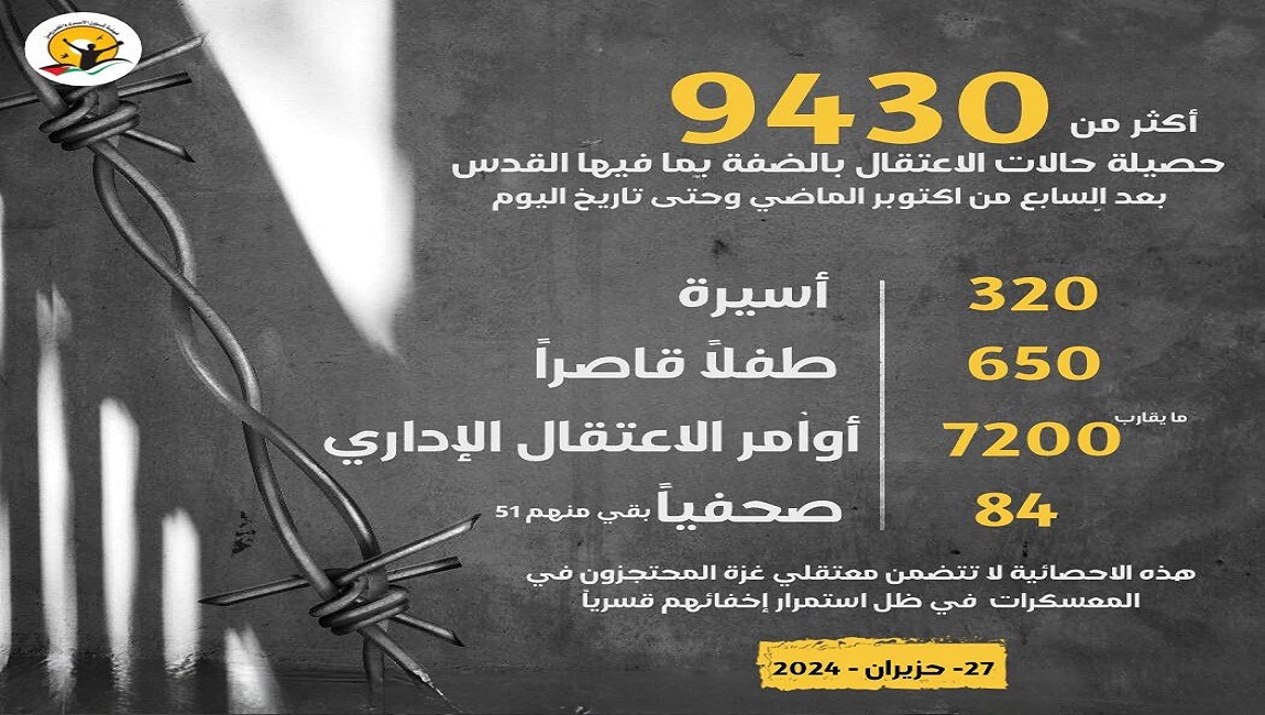 طباعة اكثر من 9430 حصيلة اعتقالات الضفة بما فيها القدس بعد السابع من اكتوبر الماضي وحتى تاريخ اليوم في 27 حزيران/يونيو 2024. نشر في تقارير احصائية