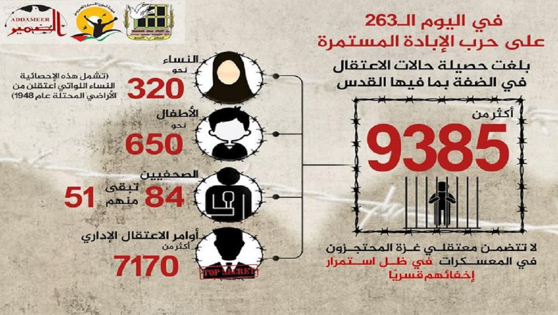 طباعة *في اليوم الـ263 على حرب الإبادة المستمرة* 📌 *بلغت حصيلة حالات الاعتقال في الضفة بما فيها القدس (9385) حالة اعتقال* في 25 حزيران/يونيو 2024. نشر في تقارير احصائية