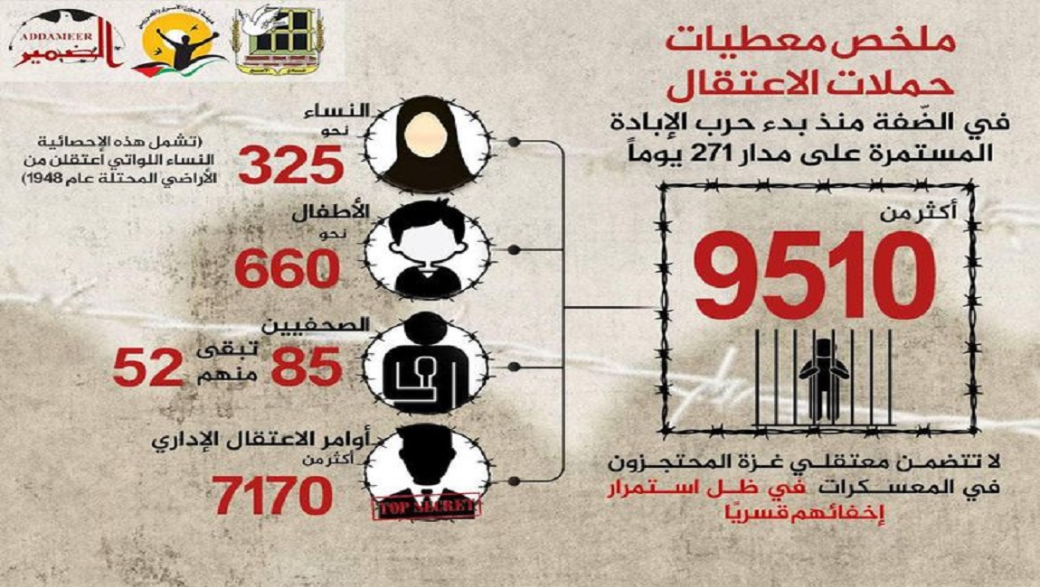 طباعة *في اليوم الـ241 على حرب الإبادة المستمرة* *بلغت حصيلة حالات الاعتقال في الضفة بما فيها القدس ما لا يقل عن (9000)* في 03 حزيران/يونيو 2024. نشر في تقارير احصائية