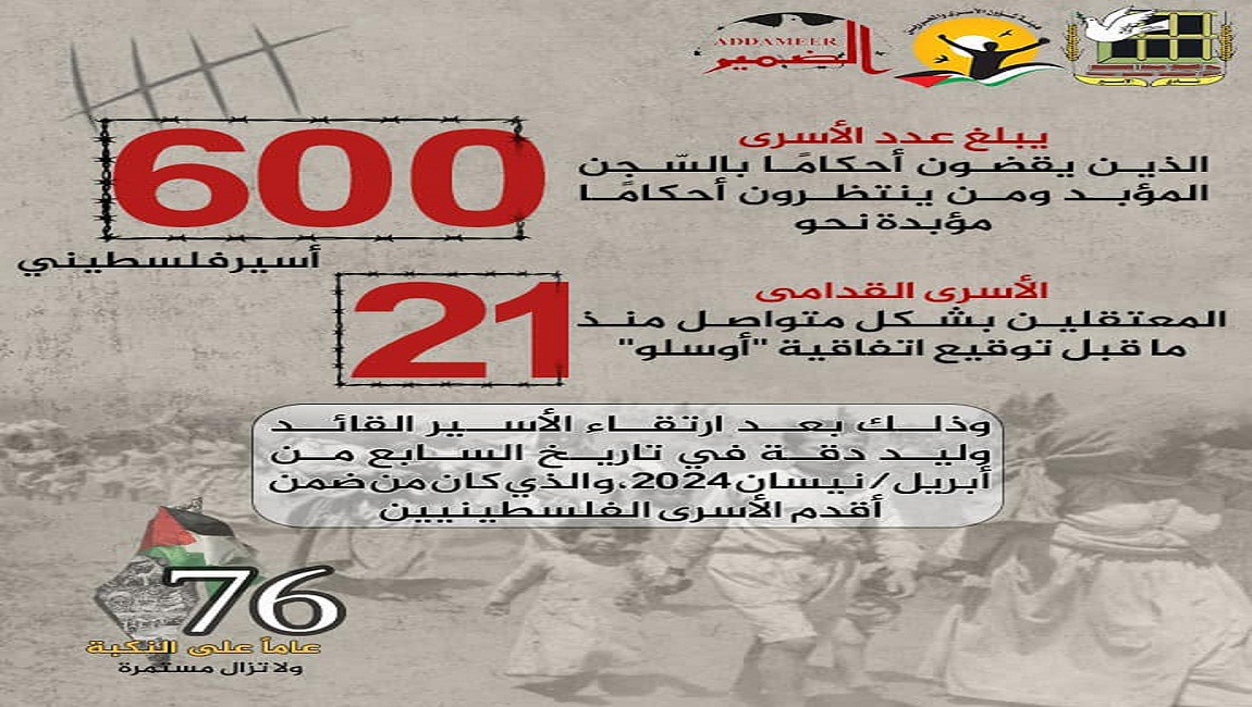 طباعة مؤسسات الأسرى: يبلغ عدد الأسرى الذين يقضون أحكامًا بالسّجن المؤبد ومن يُتوقع أن تصدر بحقهم أحكامًا بالسجن المؤبد 600 في سجون الاحتلال. في 15 أيار 2024. نشر في تقارير احصائية