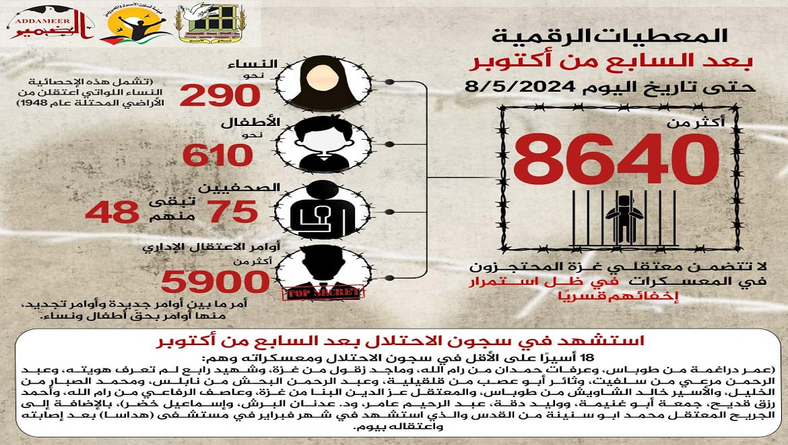 طباعة *ملخص معطيات حملات الاعتقال بعد السابع من أكتوبر حتى تاريخ اليوم 8/5/2024* في 08 أيار 2024. نشر في تقارير احصائية
