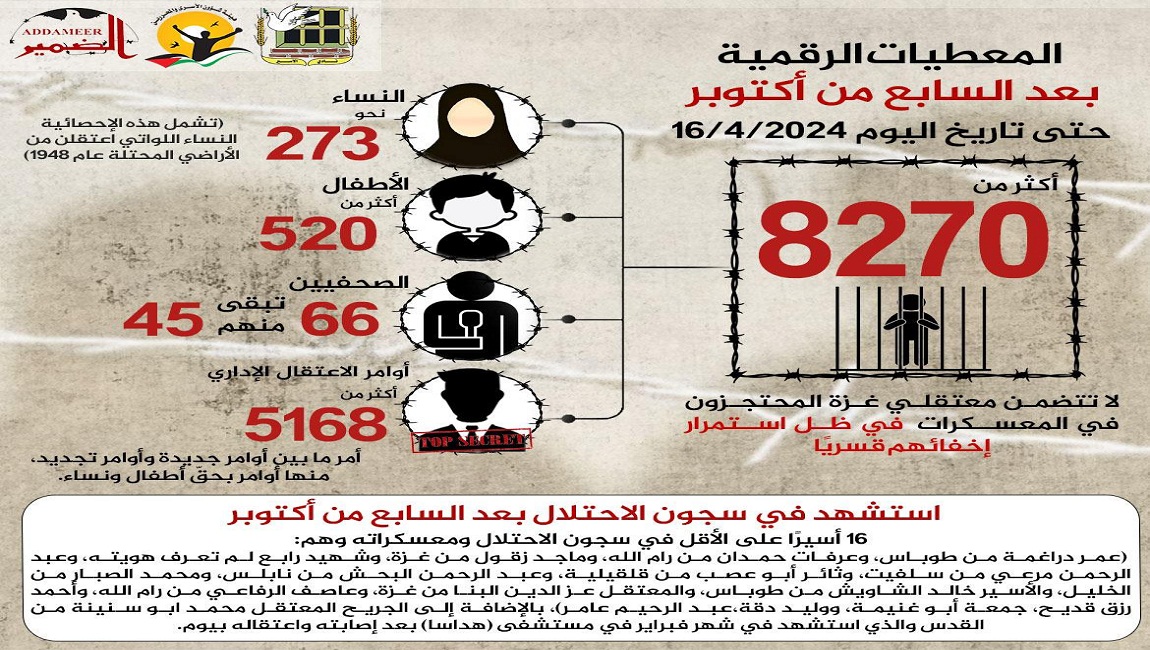 طباعة *ملخص معطيات حملات الاعتقال بعد السابع من أكتوبر حتى تاريخ اليوم 28/4/2024* في 28 نيسان/أبريل 2024. نشر في تقارير احصائية
