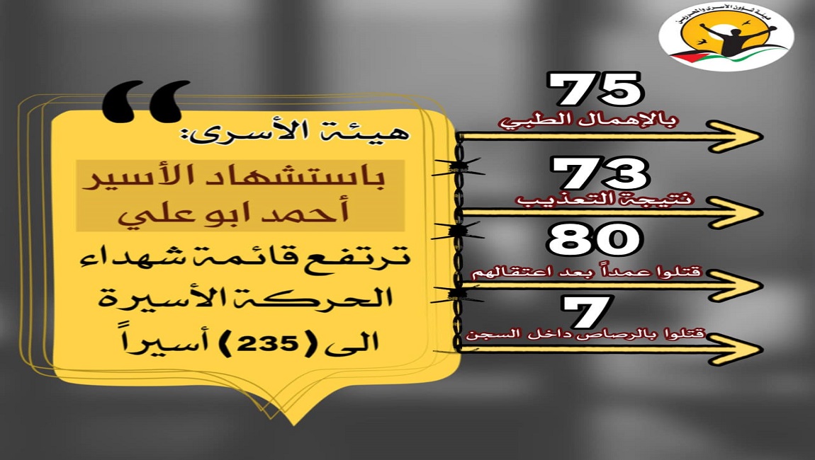 طباعة ترتفع قائمة شهداء الحركة الاسيرة الى 235 أسيراً بإستشهاد الاسير أحمد ابو علي في 10 شباط/فبراير 2023. نشر في شهداء الحركة الاسيرة