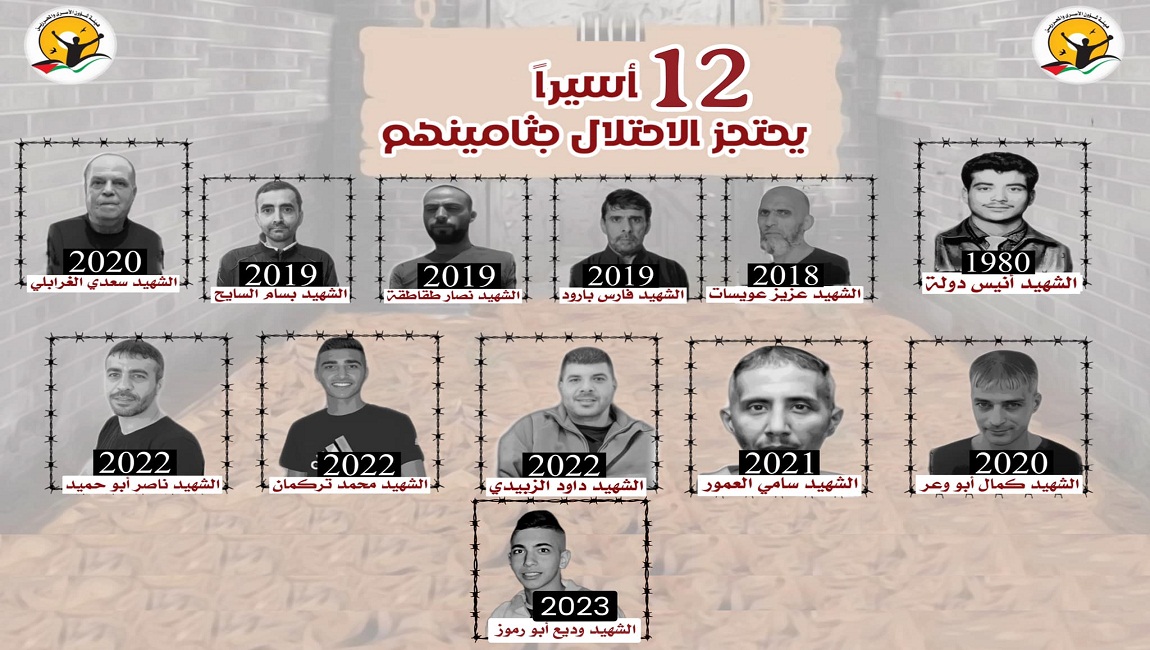 طباعة 12 أسيراً من شهداء الحركة الأسيرة يحتجز الاحتلال جثامينهم في 26 آذار/مارس 2023. نشر في شهداء الحركة الاسيرة