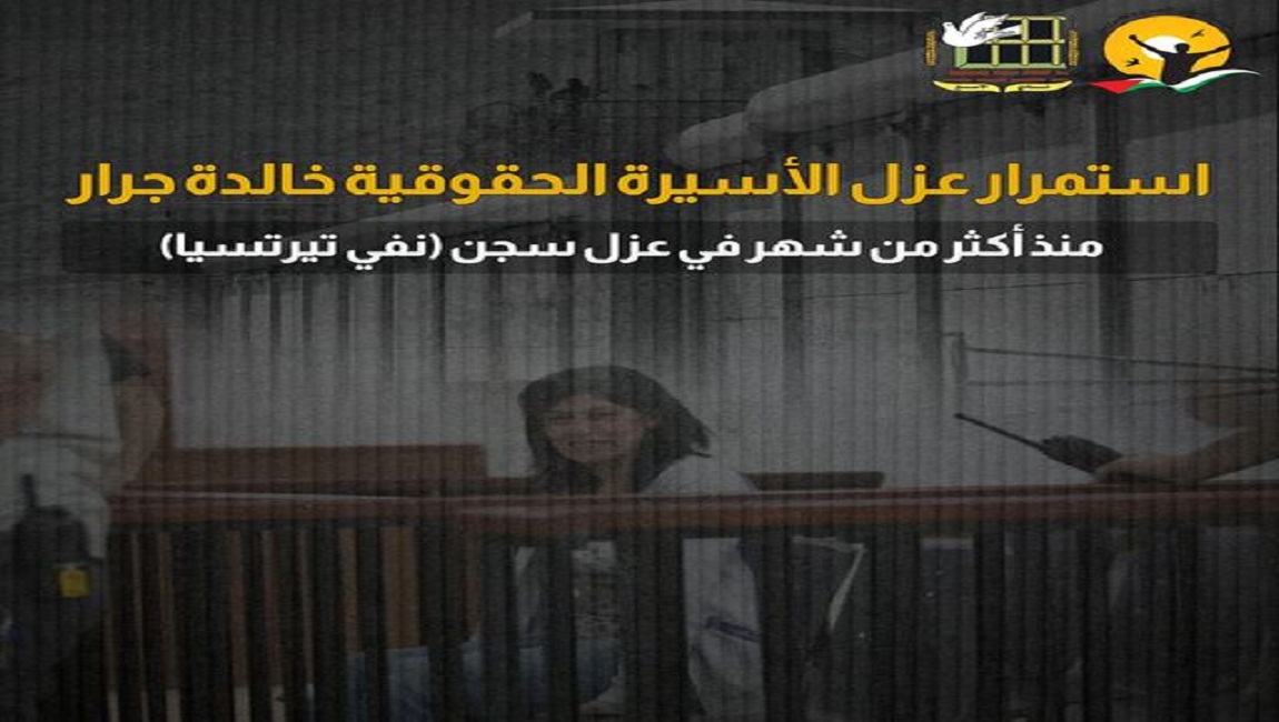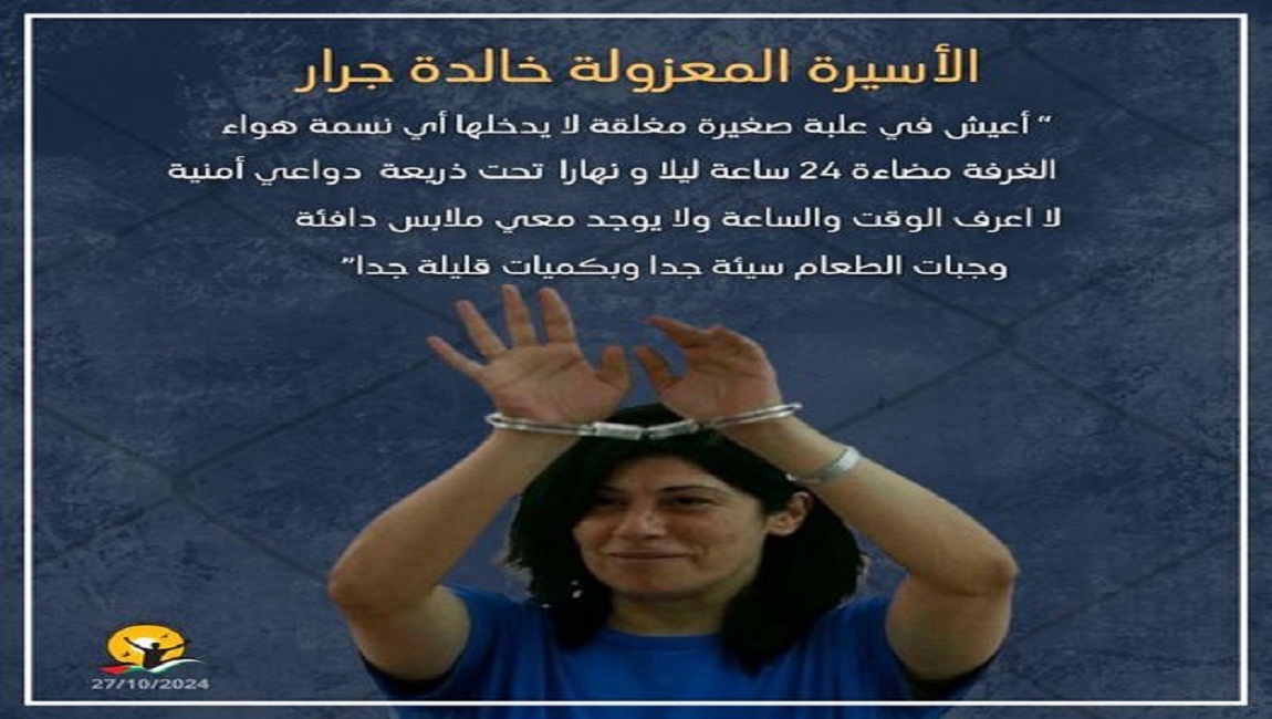 طباعة استمرار عزل الأسيرة الحقوقية خالدة جرار منذ أكثر من شهر في عزل سجن (نفي تيرتسيا) في 16 أيلول/سبتمبر 2024. نشر في الاسيرات