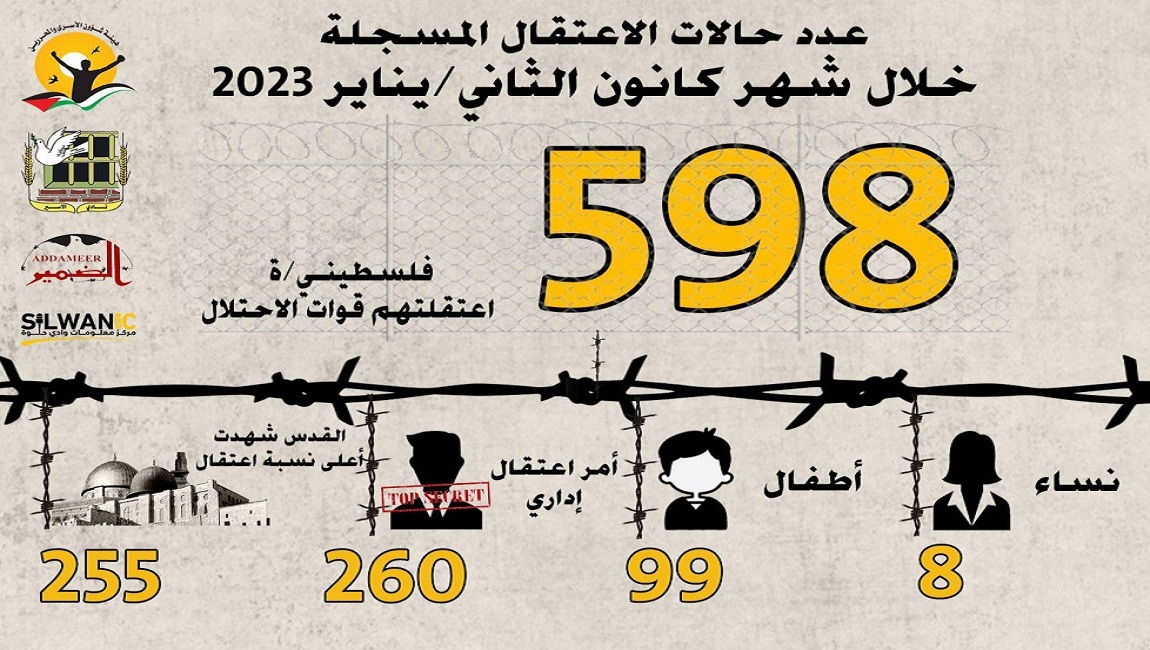 طباعة مؤسسات الأسرى: الاحتلال اعتقل (598) فلسطينياً خلال شهر كانون الثاني/ يناير 2023 في 12 شباط/فبراير 2023. نشر في تقارير احصائية