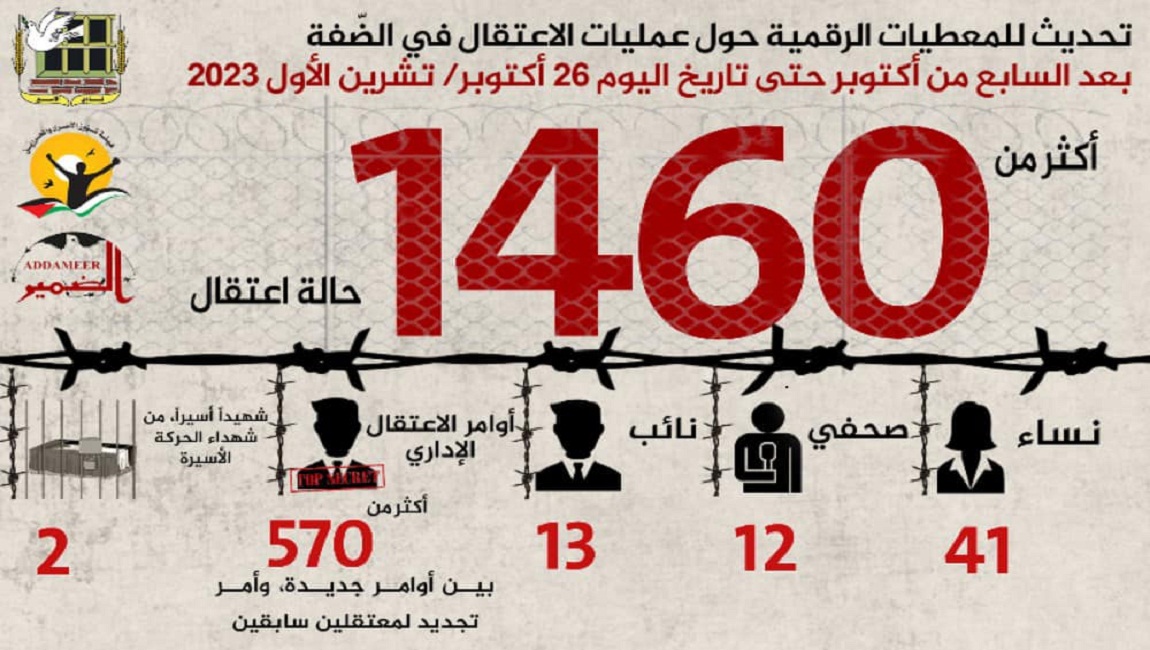 طباعة *صادر عن مؤسسات الأسرى (هيئة شؤون الأسرى والمحررين، ونادي الأسير الفلسطيني، ومؤسسة الضمير لرعاية الأسير)* *تحديث للمعطيات الرقمية حول عمليات الاعتقال في الضّفة، بعد السابع من أكتوبر حتى تاريخ اليوم 26 أكتوبر/ تشرين الأول 2023* في 26 تشرين1/أكتوير 2023. نشر في تقارير احصائية
