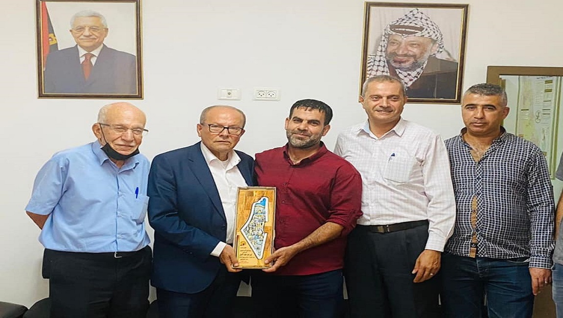طباعة اللواء قدري أبو بكر ووفد من الهيئة في زيارة وتكريم الأسير المحرر شاهر القني في 23 آب/أغسطس 2021. نشر في الاخبار العاجلة