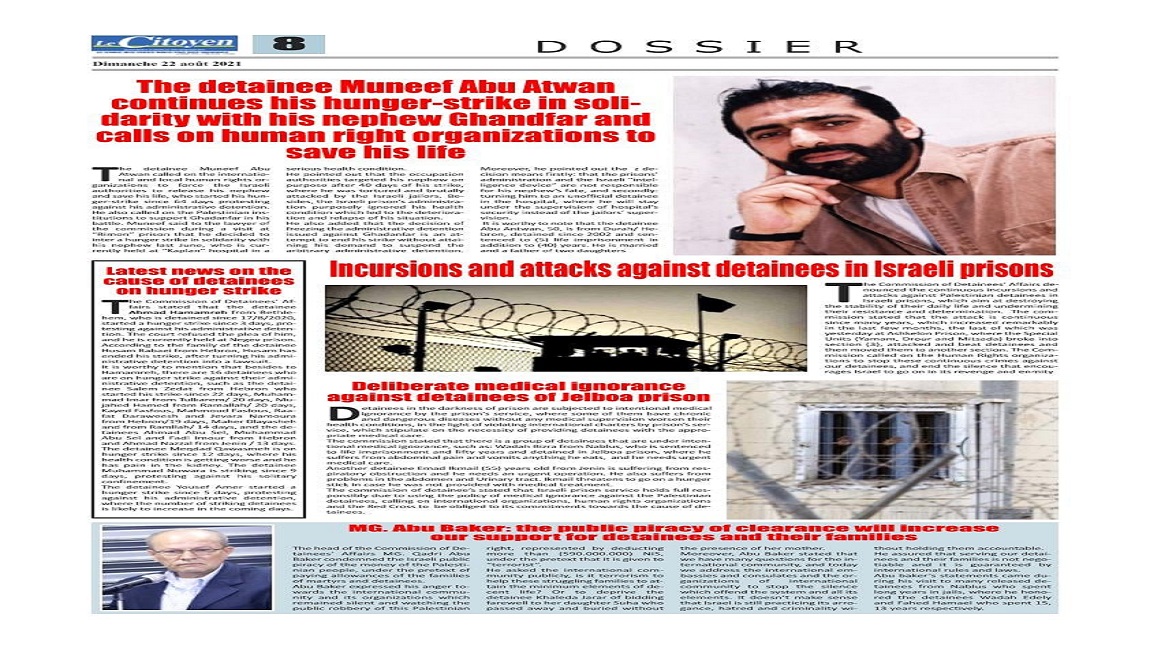 طباعة صحيفة المواطن الجزائرية تُخصص ملحقاً ثابتاً بتقارير الأسرى الفلسطينيين في سجون الاحتلال في 23 آب/أغسطس 2021. نشر في الاخبار العاجلة