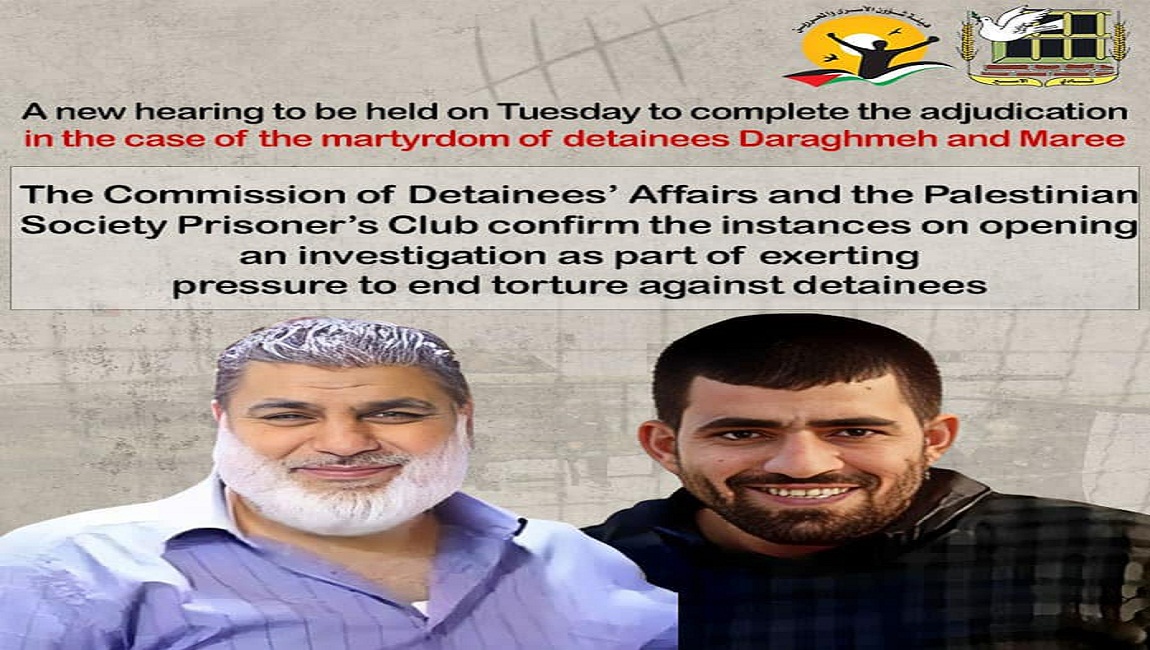 A new hearing to be held on Tuesday to complete the adjudication in the case of the martyrdom of detainees Daraghmeh and Maree