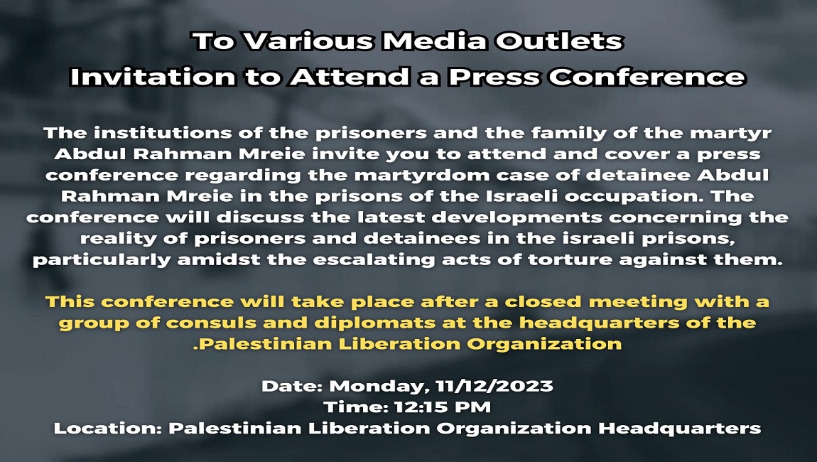 The institutions of the prisoners and the family of the martyr Abdul Rahman Mreie invite you to attend and cover a press conference regarding the martyrdom case of detainee Abdul Rahman Mreie in the prisons of the Israeli occupation. The conference will discuss the latest developments concerning the reality of prisoners and detainees in the israeli prisons, particularly amidst the escalating acts of torture against them.