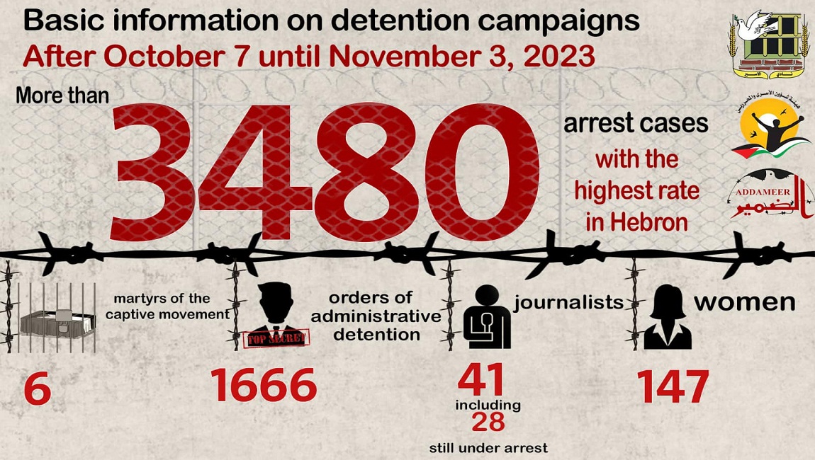 Accordingly, (3415) arrest cases have been recorded since October 7, including those who were arrested from their homes, checkpoints and others who surrendered themselves under threat and held as hostages.