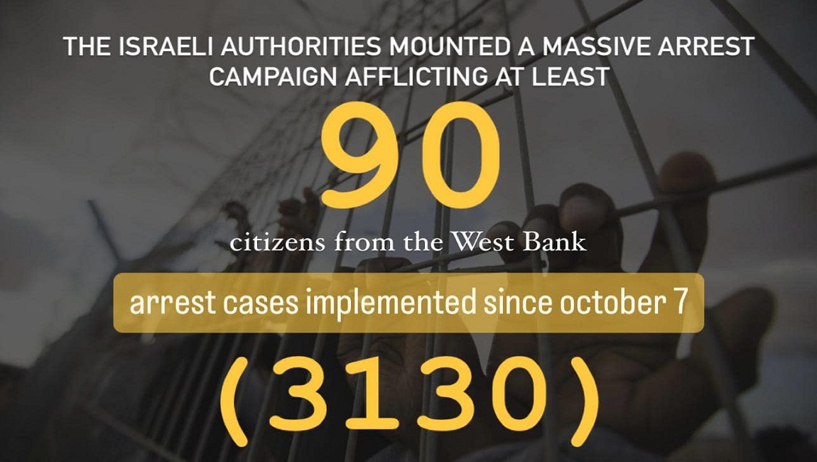 Thereby, (3160) arrest cases have been recorded since October 7, including those who were arrested from their homes, checkpoints and others who surrendered themselves under threat and held as hostages.