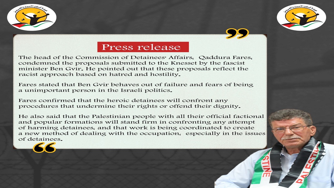 The head of the Commission of Detainees' Affairs, Qaddura Fares, stated that the reduced ethics of the occupation system violates the humanitarian standards and the principles of international humanitarian law.