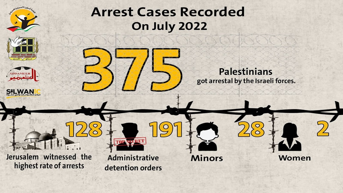 Print Detainees' Institutions: the Israeli authorities arrested (375) Palestinians on July 2022 on 18 August 2022. Posted in statistical reports