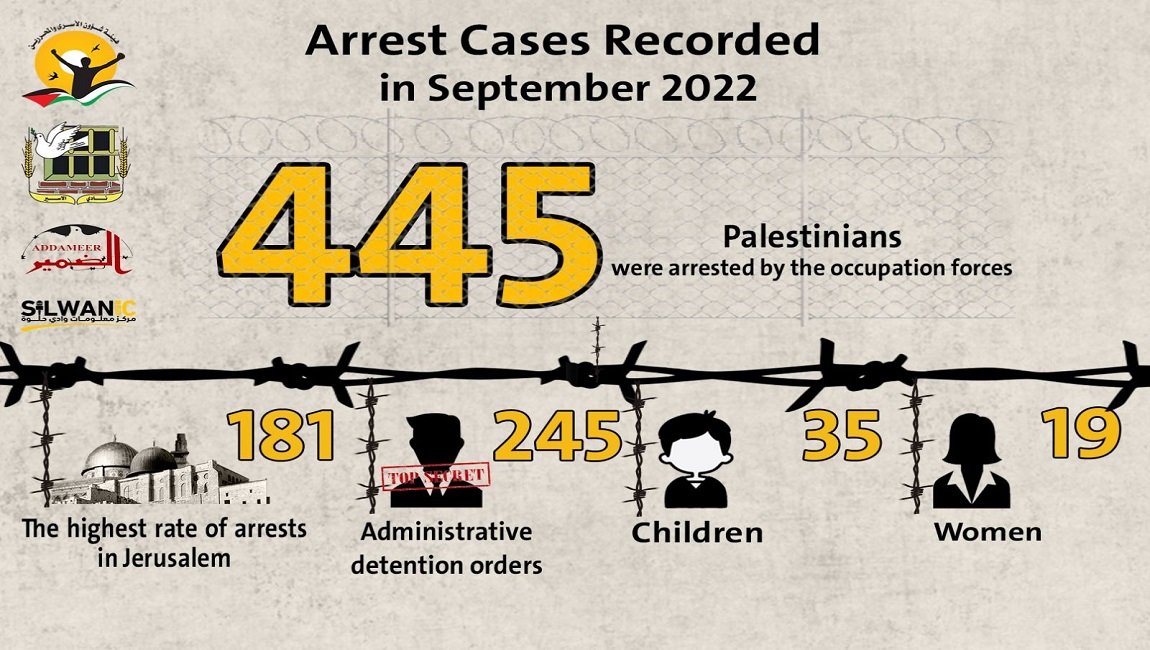 Print Detainees' institutions: the occupation forces arrested (445) Palestinians in September 2022 on 18 October 2022. Posted in statistical reports