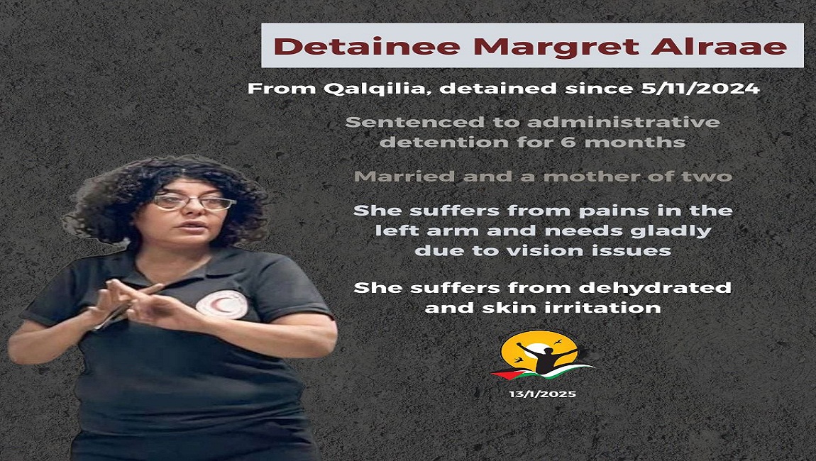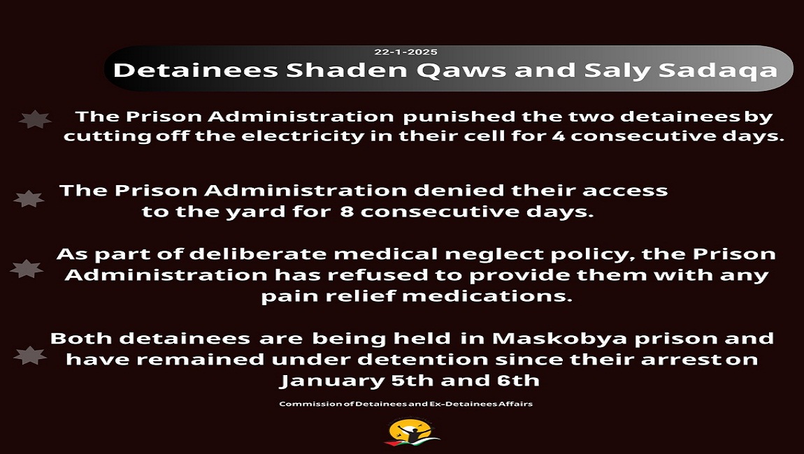 Print Details on detention conditions for both detainees Shaden Qaws & Saly Sadaqa on 22 January 2025. Posted in Female Detainees